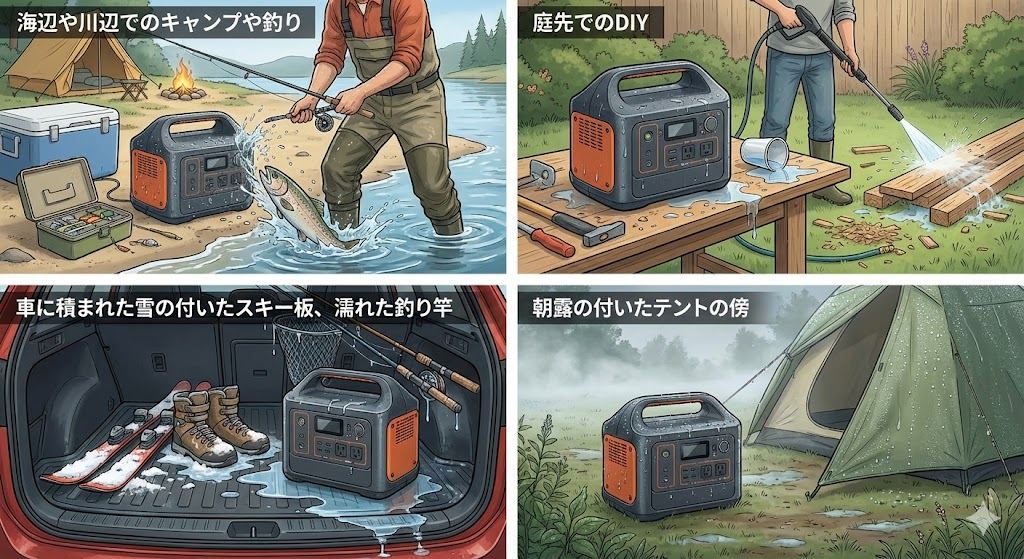 アウトドアでは、様々な要因によりポータブル電源が濡れてしまうことがあります。