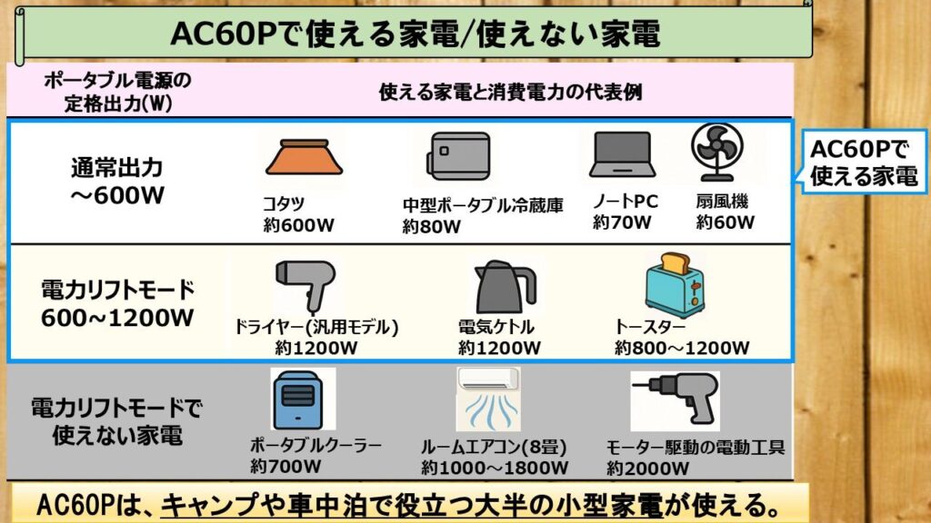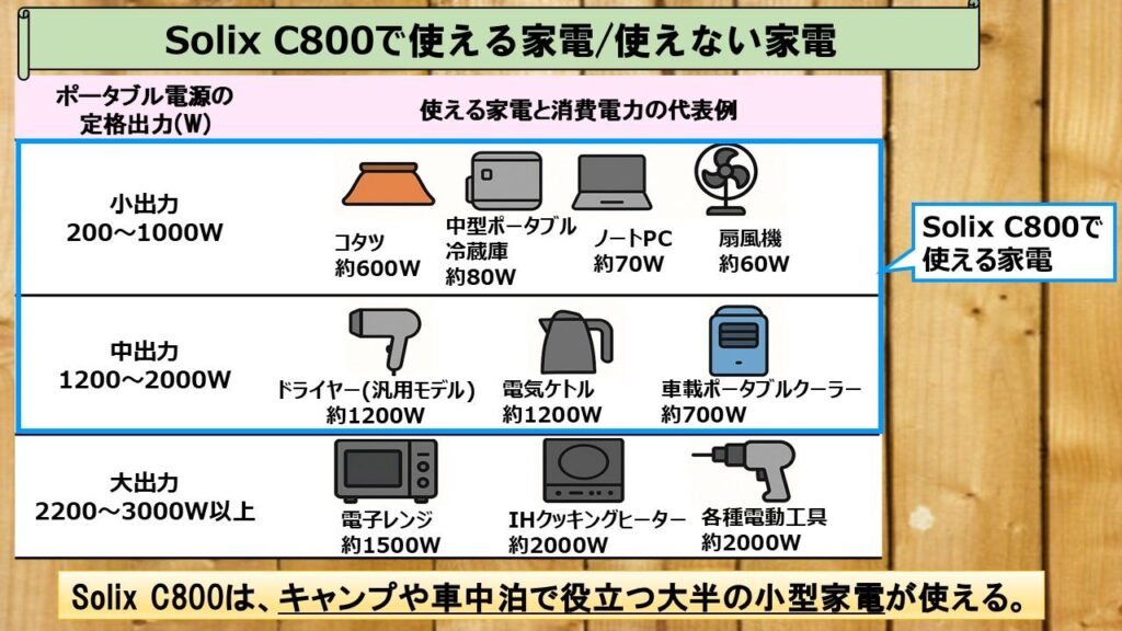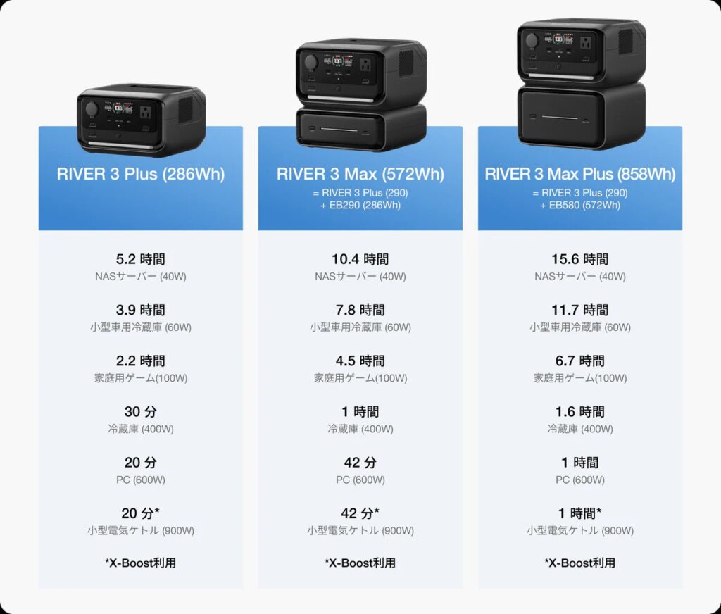 • バッテリー容量(Wh):家電の使用時間を見極める基準。