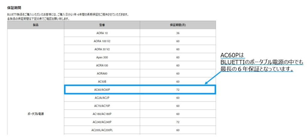 その中でも、AC60Pの保証期間は最も長い6年です。