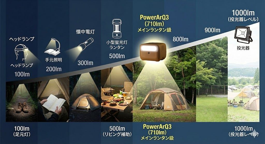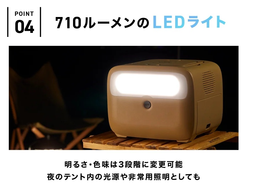 PowerArQ3は本体に710ルーメンのLEDライトが付いており、テント内や車中泊の足元、枕元の照明にもピッタリです。