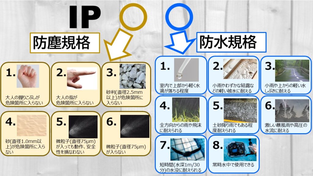 こうしたトラブルを防ぐためにも、防水・防塵性能を示す「IP保護等級」をチェックして製品を選ぶことが大切です。