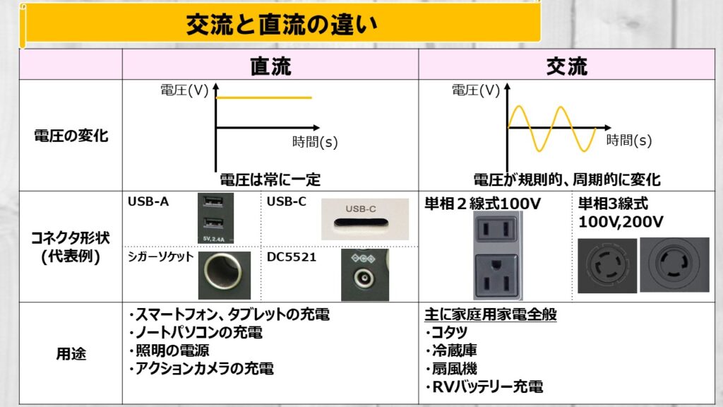 家庭用コンセントは100V、USB-Aコネクタは5Vが一般的です。 - 電力(W):電流(A)×電圧(V)で示される。