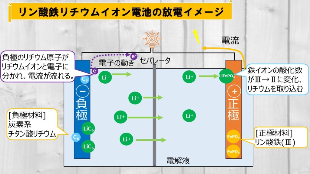 負極に蓄えられたリチウム原子が電子を放出する点は3元系と同じですが、正極側でリチウムイオン原子が結合するのがリン酸鉄(Ⅲ)となります。