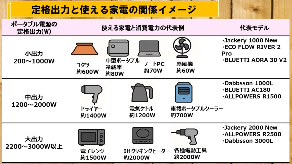 どれくらいの定格出力でどんな家電が使えるかについて、次の表に大まかにまとめました。
