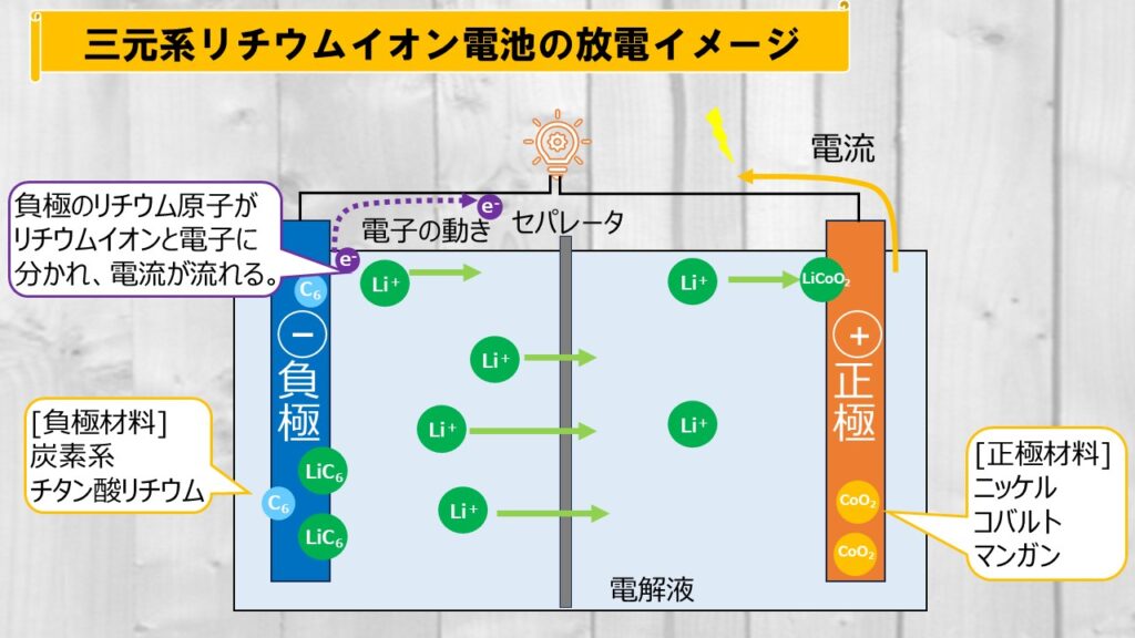 負極に蓄えられたリチウム原子が電子を放出、正極側のニッケルやコバルトと結合することで電流が流れます。