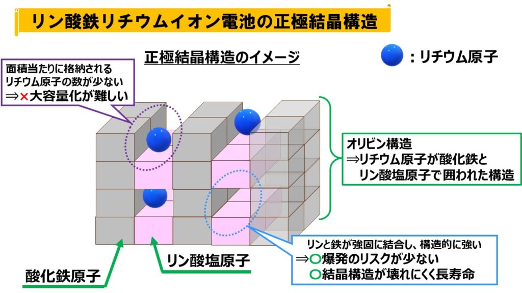 オリビン構造は壊れにくく、リチウム原子が抜けにくい為、爆発、発火リスクが小さくなります。