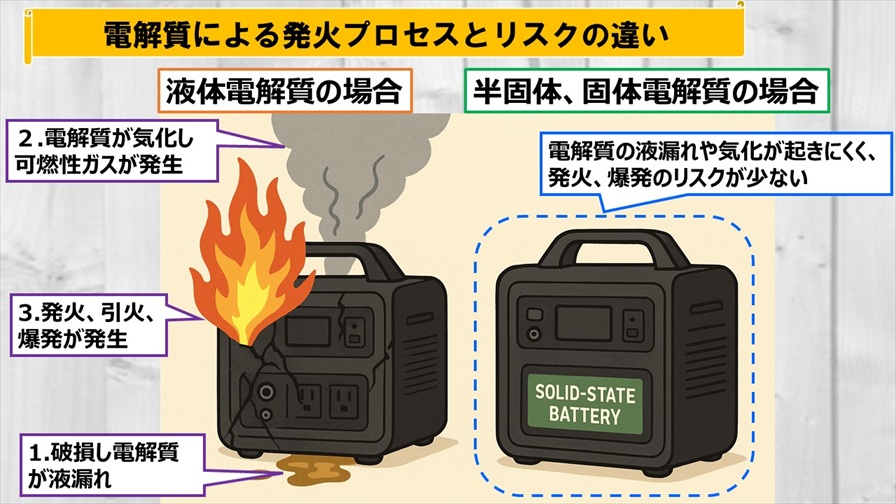 ポータブル電源の電解質は主に液体と半固体が使用され、それぞれ特徴が異なります。