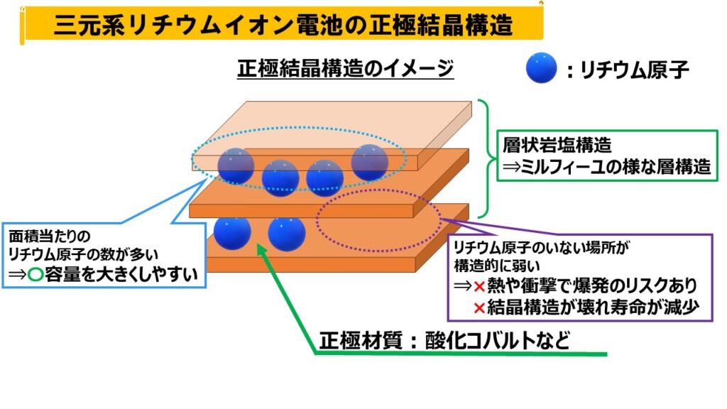 | 軽く大容量化しやすい。 正極が層状の構造なので、同じ体積に多くのリチウム原子を蓄えられる。 正極材に配合されるニッケルは、2回酸化還元反応を行える。(Ni+2→Ni+3→Ni+4) 高出力が出せる コバルトやニッケルは導電性が高く、大出力が必要な電動工具やドライヤーなどの使用に向いている。 | 爆発リスクが高い 過充電で正極の層構造からリチウム原子が抜け、不安定化する。 過充電時に正極から酸素が発生する。 熱暴走のリスクが高い 雰囲気温度が200℃を超えると酸素を発生する。 寿命が短い 正極の層構造からリチウム原子が抜けすぎると、結晶構造が壊れ容量が減少する。 価格が高い 正極材にレアメタル(コバルト、ニッケル等)を使用するため。 |